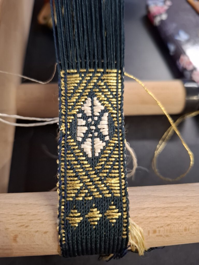 Ich habe dann ein erstes Stück in Köper gewebt und dann gestoppt, weil ich gemerkt habe, dass ich mir besser doch selbst einen Webbrief schreiben sollte und ich im Foto von der Originalborte entdeckte, dass das Original sich doch von Silvias Entwurf unterschied. Da ich eine Rekonstruktion machen möchte, kommt es auch auf Kleinigkeiten an. Daher entschied ich mich für heute Schluss zu machen und in den nächsten Tagen den Webbrief herzustellen.