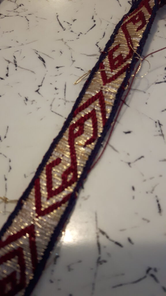 Von der historischen Borte sind rund 80 cm erhalten; sie stammt aus dem Jahr 1327 und besteht im Original aus Seide und Leinen, mit Goldlahn broschiert.