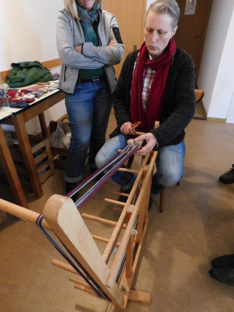 Nach der Einführung präsentierte Sylvia verschiedene Brettchen, Webrahmen und eine Auswahl an Borten, die sie mitgebracht hatte. Der Schwerpunkt des Workshops lag auch diesmal klar auf der Köpertechnik, einer vielseitigen und historisch belegten Webart, bei der diagonale Linien entstehen.