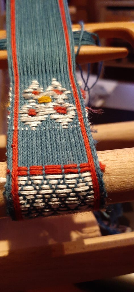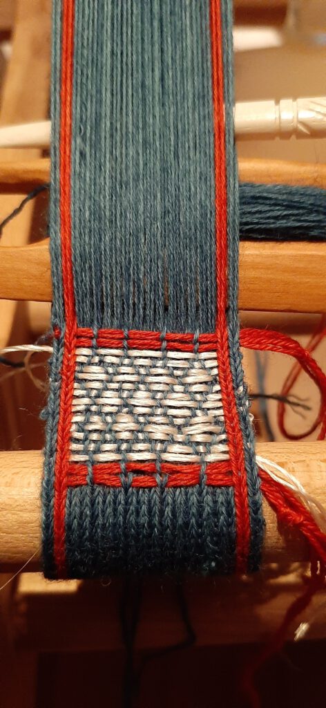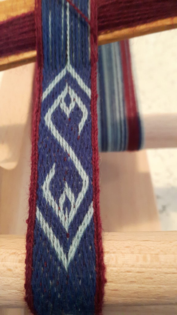 Ich habe dann ein erstes Stück in Köper gewebt und dann gestoppt, weil ich gemerkt habe, dass ich mir besser doch selbst einen Webbrief schreiben sollte und ich im Foto von der Originalborte entdeckte, dass das Original sich doch von Silvias Entwurf unterschied. Da ich eine Rekonstruktion machen möchte, kommt es auch auf Kleinigkeiten an. Daher entschied ich mich für heute Schluss zu machen und in den nächsten Tagen den Webbrief herzustellen.