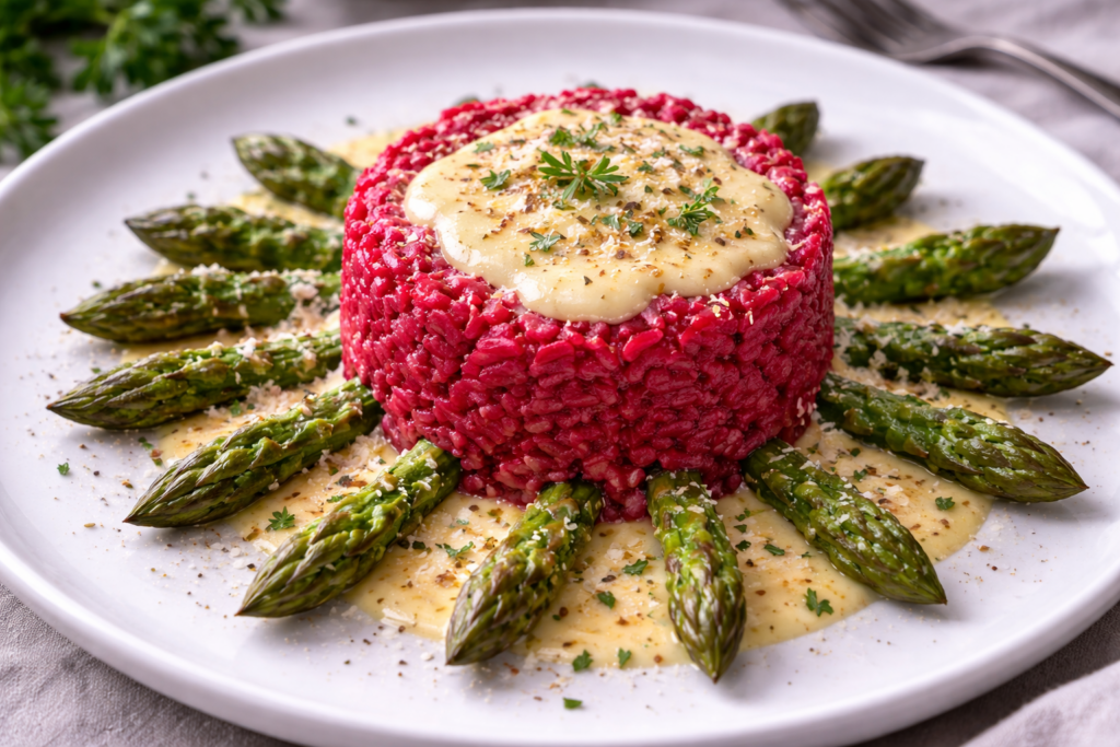 Dieses Risotto lebt von Farbe und Kontrast: cremiger Reis, tiefrote Bete, grüne Spargelspitzen und eine helle Safransahne. Der Name ist Programm – angerichtet wie ein Bild, bei dem jede Zutat ihren Platz hat. Ein elegantes Gericht, das sich besonders gut für ein Menü eignet.