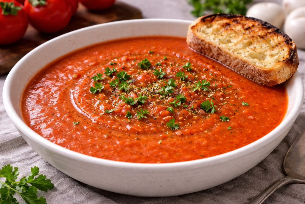 Diese Tomatensuppe ist schlicht und aromatisch. Frische Tomaten werden mit Wurzelgemüse gekocht und fein püriert. Ein Hauch Schärfe rundet den Geschmack ab. Serviert mit geröstetem Brot ist sie eine einfache, ehrliche Suppe – ideal als erster Gang.