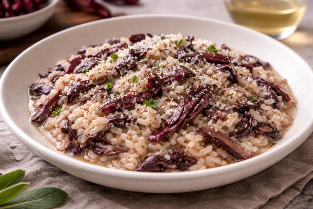 Radicchio verleiht diesem Risotto seine typische leichte Bitterkeit und Tiefe. Zusammen mit Weißwein, Brühe und Parmesan entsteht ein cremiges, ausgewogenes Gericht, das einfach zuzubereiten ist und dennoch viel Charakter hat.