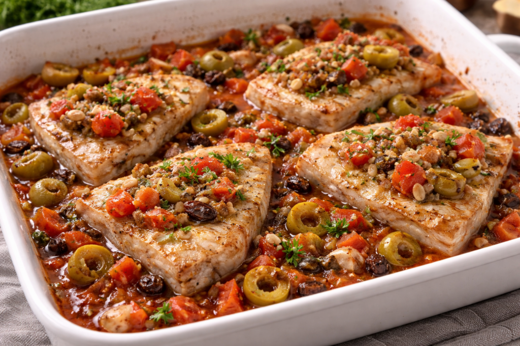 Die Agghiotta ist ein traditionelles Gericht aus Süditalien, besonders aus Sizilien. Schwertfisch wird dabei sanft im Ofen gegart und mit einer würzigen Sauce aus Tomaten, Zwiebeln, Oliven, Kapern, Rosinen und Pinienkernen kombiniert. Süße und salzige Aromen halten sich die Waage und machen dieses Gericht zu einem sehr typischen mediterranen Secondo.