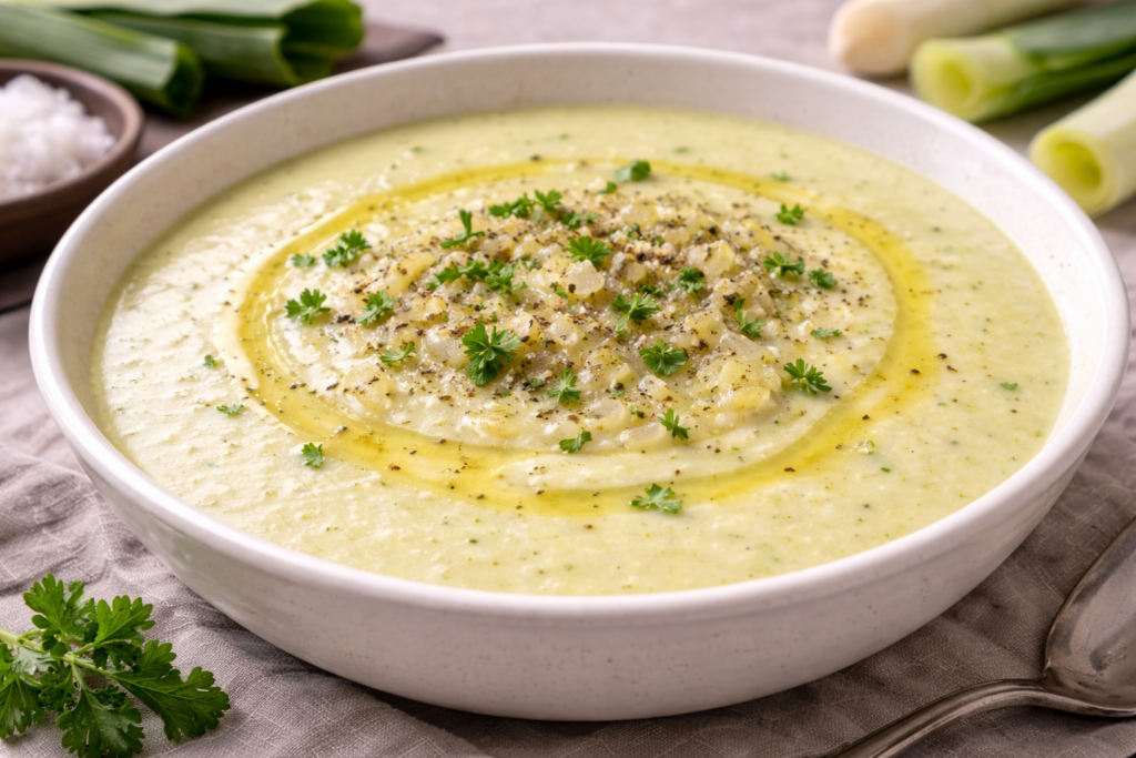 Diese cremige Lauchsuppe verbindet milden Lauch mit einer feinen Bechamelsauce. Sie ist weich, ausgewogen und wärmend – eine klassische Suppe, die sich gut als erster Gang eines Menüs eignet und durch ihre Schlichtheit überzeugt.