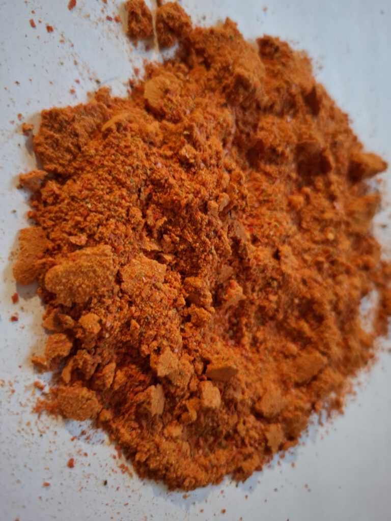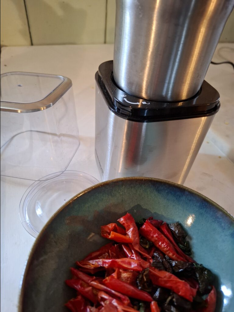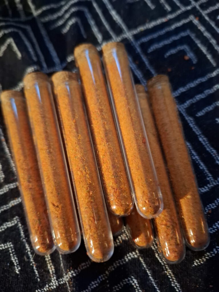 Das Ergebnis war ein warmes, rötlich-braunes Pulver, voll Aroma und ziemlich scharf. Ich habe das Pulver in kleine Gläser abgefüllt und teilweise noch Gewürzmischungen erstellt.