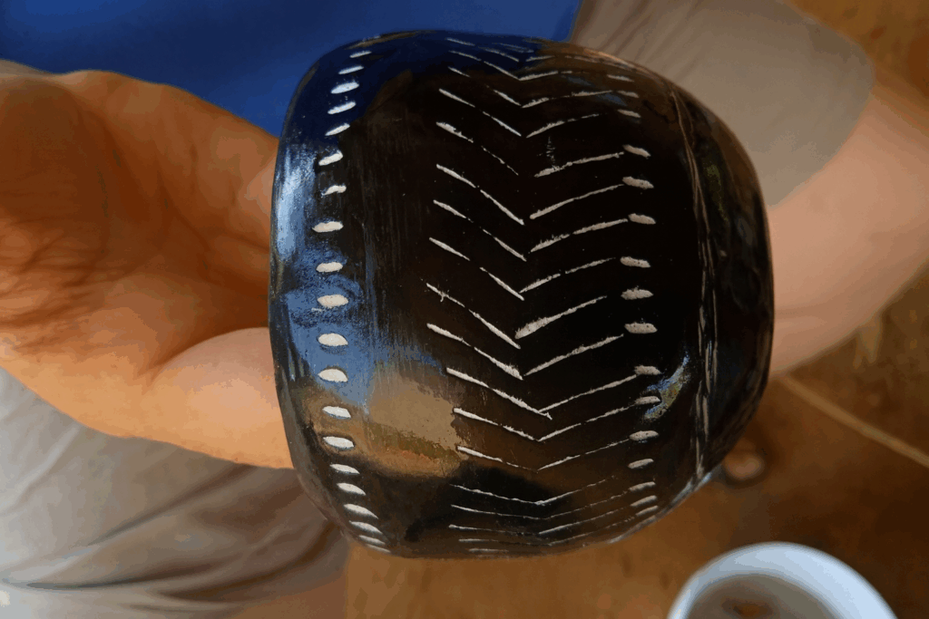 Nach dem Trocknen bleibt ein deutlicher, hellfarbiger Kontrast zurück, der die Ornamentik hervorhebt und den Gefäßen ihr typisches Aussehen verleiht.