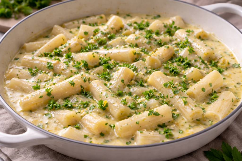 Schwarzwurzeln gelten als feines Wintergemüse. In diesem Ragout werden sie sanft geschmort und mit Zitrone, Petersilie und Eigelb zu einer cremigen, milden Sauce verbunden. Ein ruhiges Gericht, das als Beilage oder als leichter Hauptgang überzeugt.